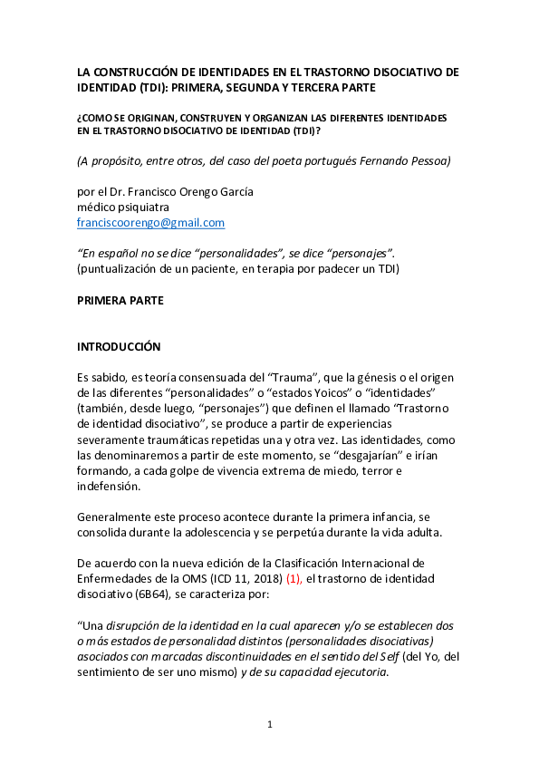Doc La Construccion De Identidades En El Trastorno De Identidad Disociativo Tdi Dr F Orengo Docx Francisco Orengo Garcia Academia Edu