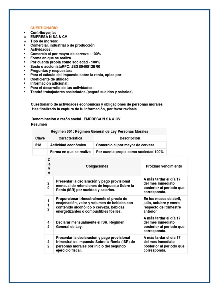 Cuestionario Personas Morales Salario Impuesto Sobre La Renta